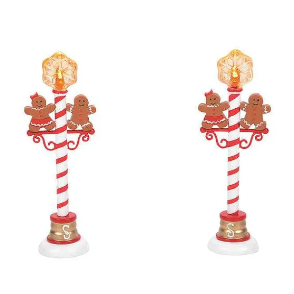 A Pair Of Happy Gingerbread Figures Dance Atop These Red And White Striped Street Lamps. The Lights Are Covered With Led Snowflakes To Make The Season Even Brighter.